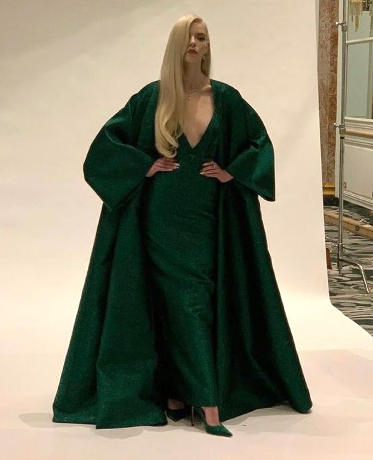 La ganadora como Mejor Actriz Dramática en Miniserie sorprendió a todos sus seguidores con una gran pieza en color verde de Gucci. El vestido tenía un escote profundo y una capa pesada que acompañaba el outfit, todo en un material brilloso sin ser lentejuelas. Su cabello extra platinado y su makeup fueron un 10.