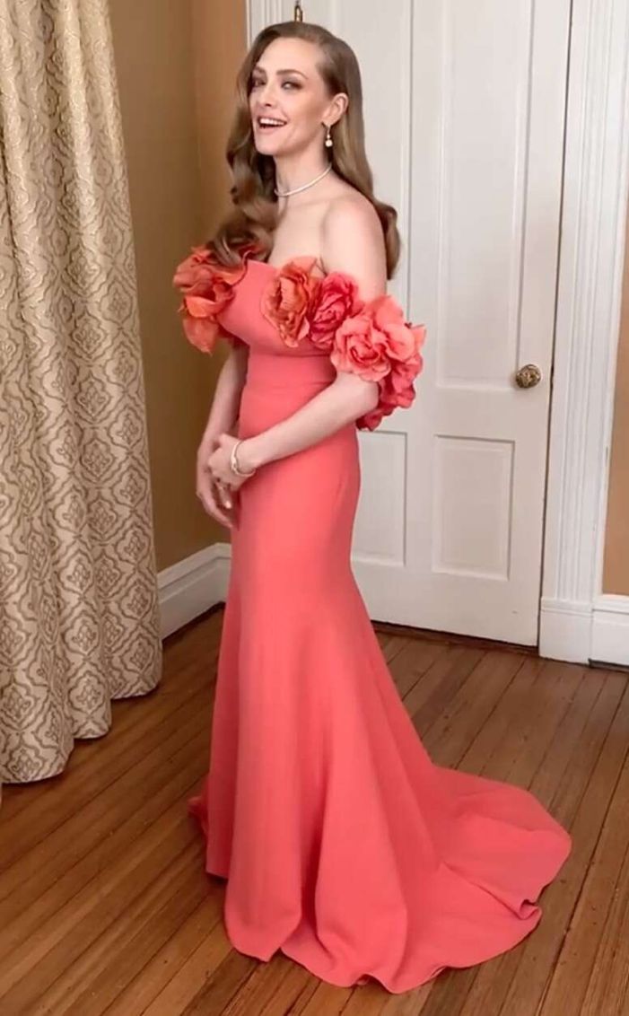 Otra de nuestras blondas favoritas es Amanda. Recibió una nominación por su papel en “Mank” y no dejó pasar su oportunidad con un Oscar de la Renta de cola sirena en color coral. ¿El toque? Una tira, estilo cascada de flores que caía sobre su espalda.