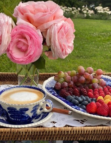 Un desayuno clásico y nutritivo. El café con leche es su infaltable y el plato de frutas, también. Además, aprovecha la ocasión para mostrar su delicada vajilla deco, pintada a mano o con detalles rústicos que embellecen la foto.