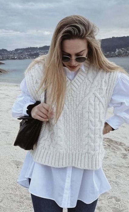 De inspiración retro, los chalecos tejidos con detalles en el punto son ideales para crear looks románticos o de trabajo. Se combina con prendas sencillas y clásicas que nunca pasan de moda. En crudo, tiza, blanco y colores claros se usa sobre colores pastel como una camisa rosa bebé o celeste.