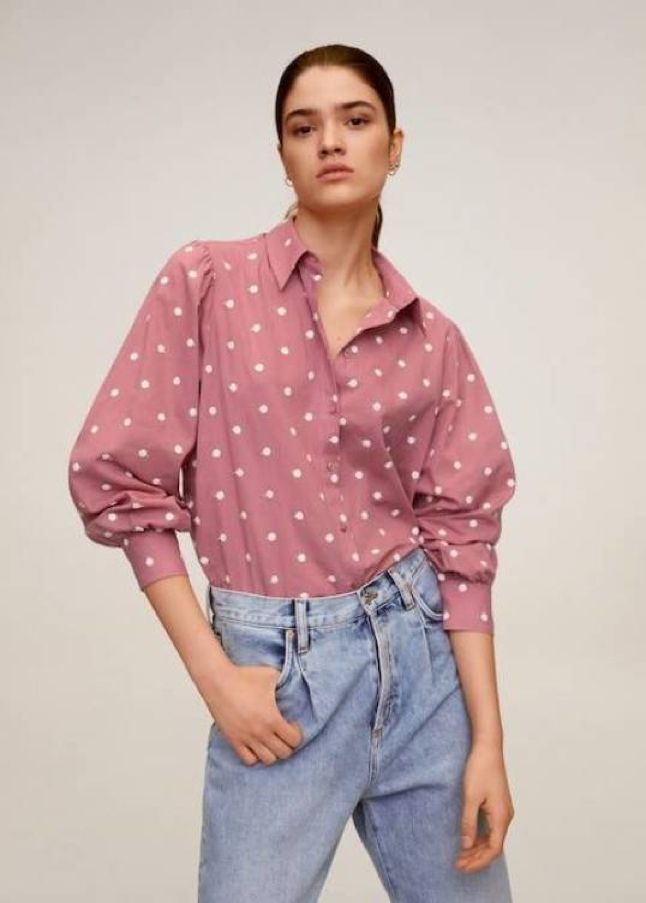 Mango también ha lanzado su propia versión un poco más infantil o preppy: en color rosa palo con puntos blancos medianos, mangas abullonadas y solapas en el cuello. Otra opción que podemos usar en el día y queda muy bien con pantalones blancos.