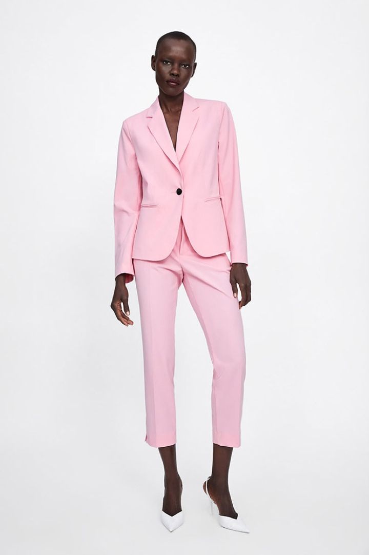 ¿Dónde se puede conseguir un look parecido al de Letizia? ¡En Zara! La firma ha lanzado miles de trajes en rosa, pero seleccionamos este ya que creemos que es el más parecido al de la Reina, por la forma de la chaqueta y el pantalón.
