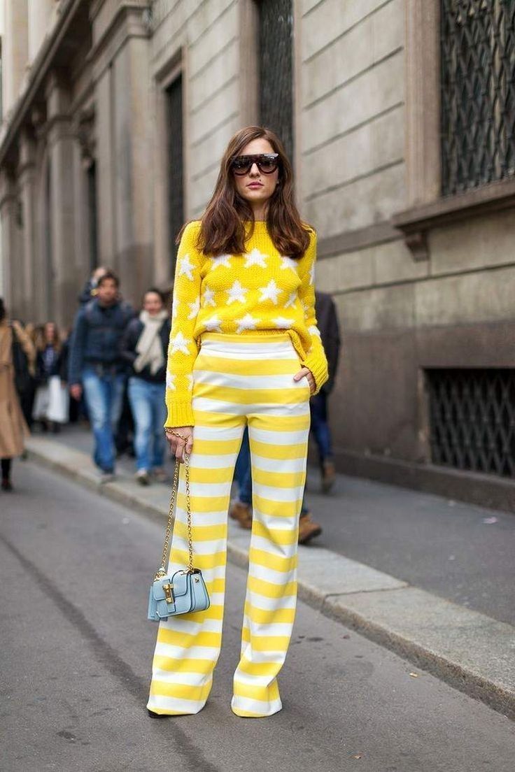 Es el look más atrevido pero, aunque es difícil lograrlo, fíjense qué bien están combinadas ambas estampas de líneas y estrellas, ya que ambas combinan con los mismos colores: blanco y amarillo.