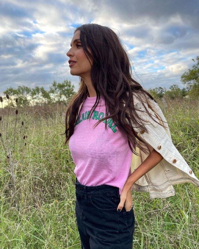 La conductora eligió unos jeans azul oscuro, con una camiseta rosa pastel con estampa y una chaqueta de denim blanca. Un outfit para nada recargado e ideal para que uses durante el día y estés cómoda.