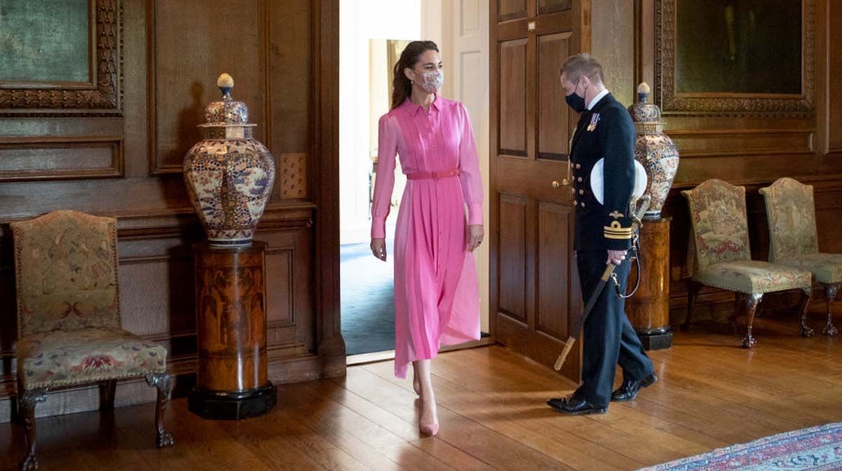 Su barbijo floreado también le hacía honor a una marca londinense que se fabrica en España: Amaia, una de las favorita en barbijos, para la Duquesa. Los accesorios fueron unos salones de ante de Gianvito Rossi y un sobre de Métier, ambos en el mismo color ocre.