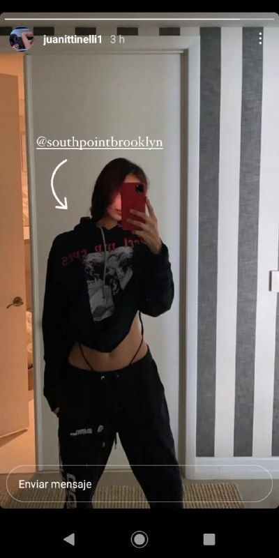 Los pantalones tanga son otra de las grandes tendencias que ya se las hemos visto a celebrities como Kylie Jenner. Juanita decidió llevarlos de estilo militar o cargo, bien anchos, en negro junto con una tanga negra y un buzo. Un estilo deportivo pero tendencioso. ¿Lo usarían?