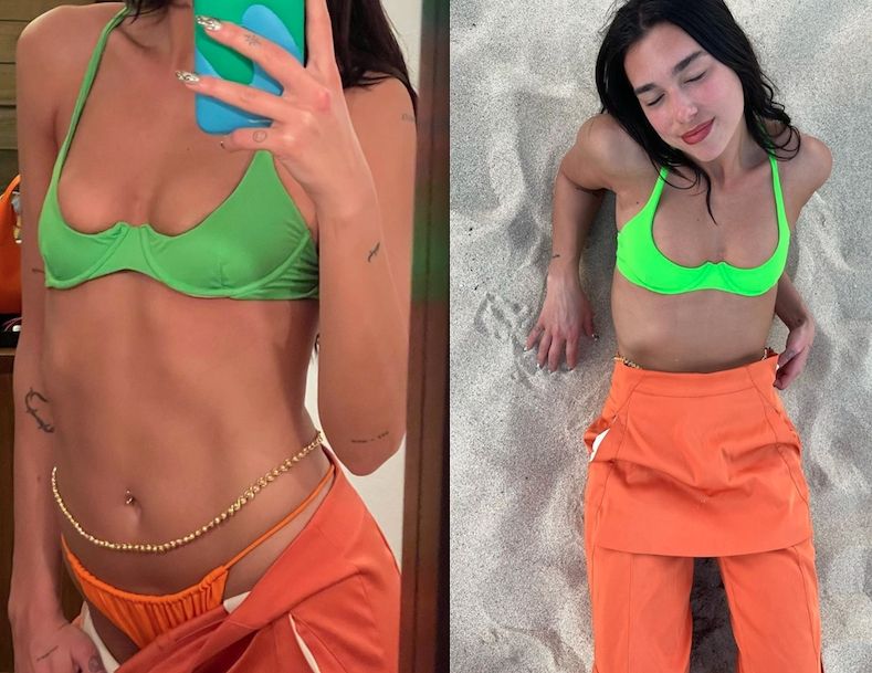 El repaso por los más originales trajes de baño del verano 2022 incluye dos personajes del exterior. La cantante Dua Lipa rompió Instagram cuando compartió una serie de fotos con una micro bikini tejida a crochet y con diseños súper coloridos: una flor, una planta, un arcoiris… y millones de likes.