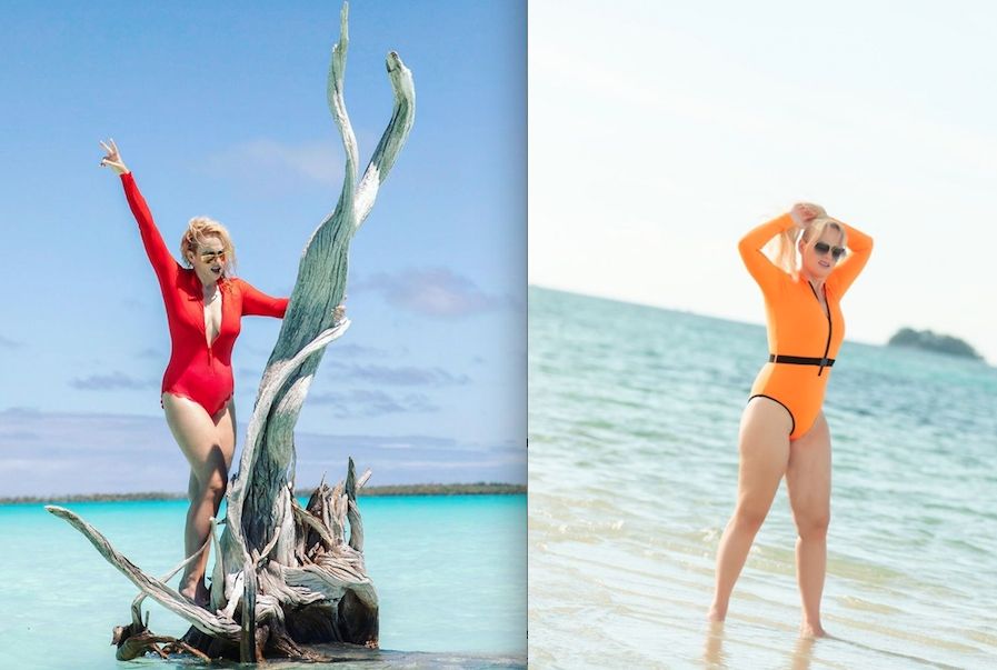 Rebel Wilson usó trajes de baño de manga larga, con cierre delantero para generar un escote pronunciado y en colores shocking que hacen vibrar la moda veraniega.