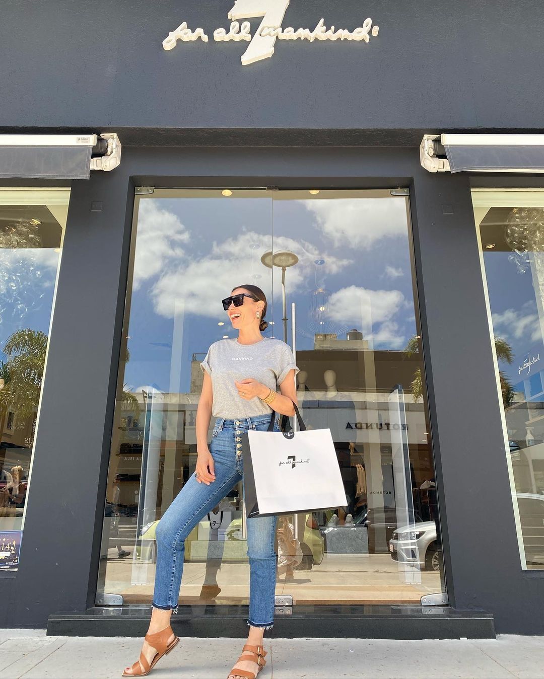 Pampita no es de usar muchos jeans sino más que nada vestidos o faldas, pero aquí vemos una excepción con estos de tiro súper alto y ajustados, estilo pitillo. Los combinó con una camiseta gris, sandalias marrones de tiras gruesas y sus gafas de sol favoritas, que son estas. Cuadradas, futuristas y en color negro, de su colaboración con la marca Infinit.
