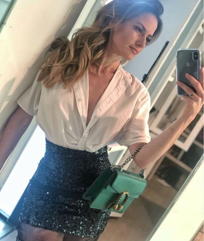 En la foto se ve a Altaír Jarabo con una minifalda de lentejuelas color verdes que combinó a la perfección con un bolso del mismo tono y unas pantimedias negras transparentes. Todo el look lo completó con una camisa blanca manga corta, a la cual le desajustó varios botones para que quede un impresionante escote.