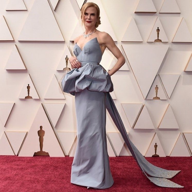 La actriz nominada por Being the Ricardos eligió un vestido con volumen, de Armani. El color fue especialmente hecho por la casa para ella. “Nicole estuvo sobresaliente y muy segura. Con un modelo muy parecido a un Armani que había usado en años anteriores en un azul cobalto. En esa oportunidad con un moño y ahora con un peplum”, afirma Saiach. “Nicole Kidman siempre está correcta, tiene el color, el maquillaje indicado, pero un poquito aburre”, asegura Fabián Paz. “Es divina, pero ese vestido con un gran polisón, no se si la favorece. El volumen le hace una cadera demasiado prominente. El make up y el pelo están súper bien”, agrega Juricich.