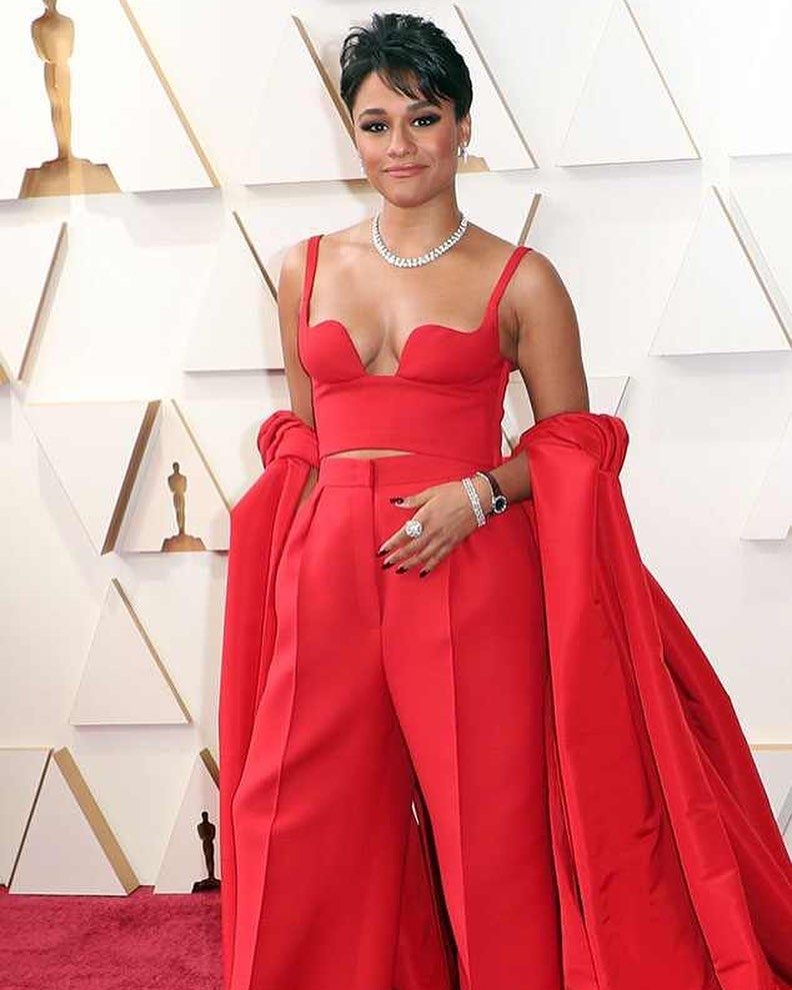 La ganadora del Oscar como mejor actriz de reparto por West Side Story, se animó a usar pantalones en la alfombra roja. Con un modelo rojo intenso, compuesto por un crop top y unos pantalones anchos. Pero sin dudas el ítem más llamativo de su look fue ese abrigo capa con super volumen. “La actriz apostó por un pantalón y un croptop colorado, con ese chal increíble, divino. No sé si ese escote es el que más la favorece, pero el look general está muy bien”, afirma Jurisich. “Fue a lo seguro eligiendo un Valentino. Con este diseñador no te equivocás nunca. Y el color también es emblema de la marca. El escote y los pantalones son el ítem de la temporada en alta costura”, suma Paz.