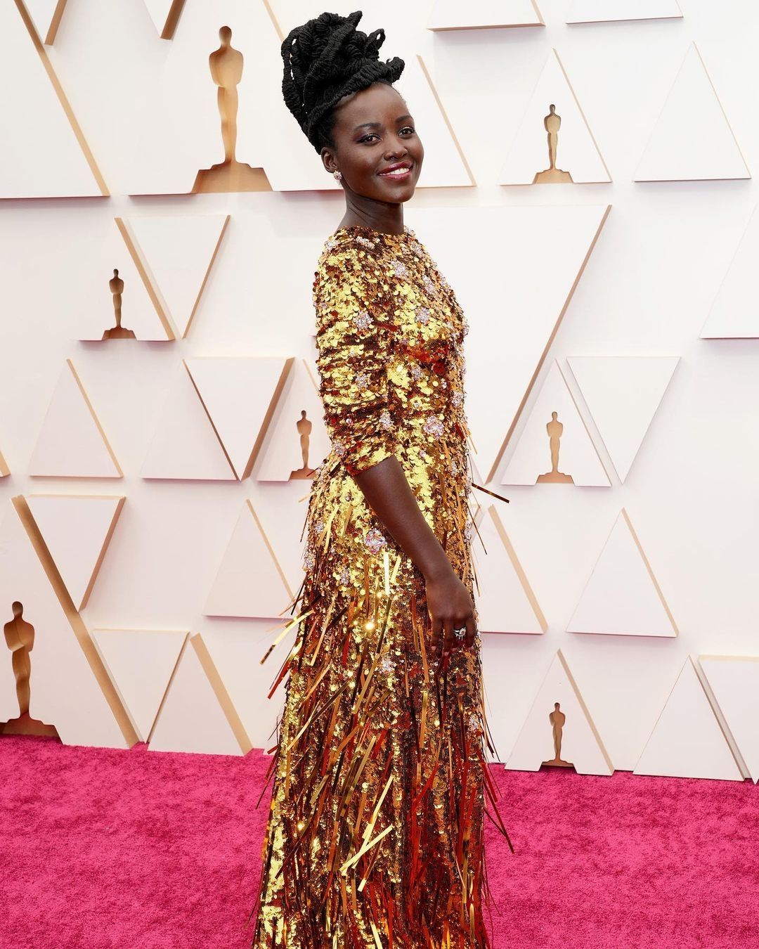 Lupita Nyong'o, una de las actrices más elegantes, ha vuelto a recurrir a la casa Prada. Llevó un vestido de lentejuelas de distintas formas, todas en tono dorado. La actriz ya había apostado por vestirse con el color de la estatuilla en 2018, es que el dorado le queda perfecto con el tono de su piel. “Lupita se ha transformado en los últimos años en la reina de la alfombra roja. Nunca defrauda, siempre está super trendy a la vanguardia. En este caso deslumbró con un Prada toda de dorado. Me encanta”, asegura Paz. Juricich coincide en elogiar el look y detalla un ítem tendencia “El dorado y los vestidos con mangas son tendencia”. Saiach también destaca este look: “Lupita siempre es una reina de las entregas de premios. Estuvo con unas lentejuelas rectangulares con detalles en rosa, usó metalizado más colores pasteles”.