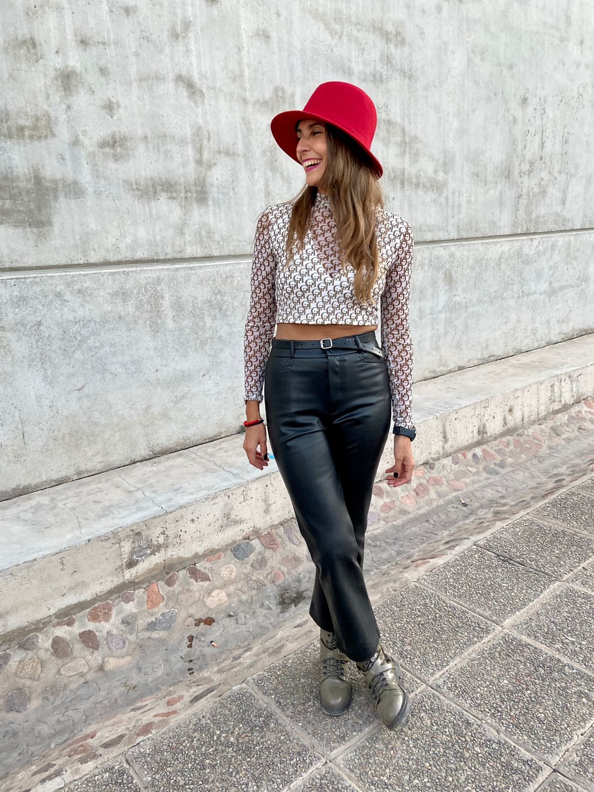 Melina también destacó en el evento por su gran look. Remera manga larga cropped, con pantalón de cuero cintura alta recto y lo combinó con botas plateadas y sombrero rojo, ambos complementos haciendo mutch con el print de la blusa.