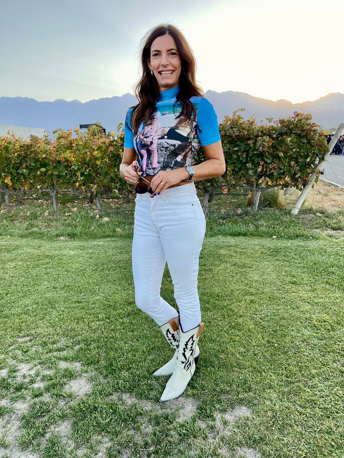 ¡Carolina Garavaglia fue por los colores y resaltó! Eligió una remera celeste con estampa, pantalón blanco y texanas blancas y negras. ¡tendencias, confort y mucha onda!
