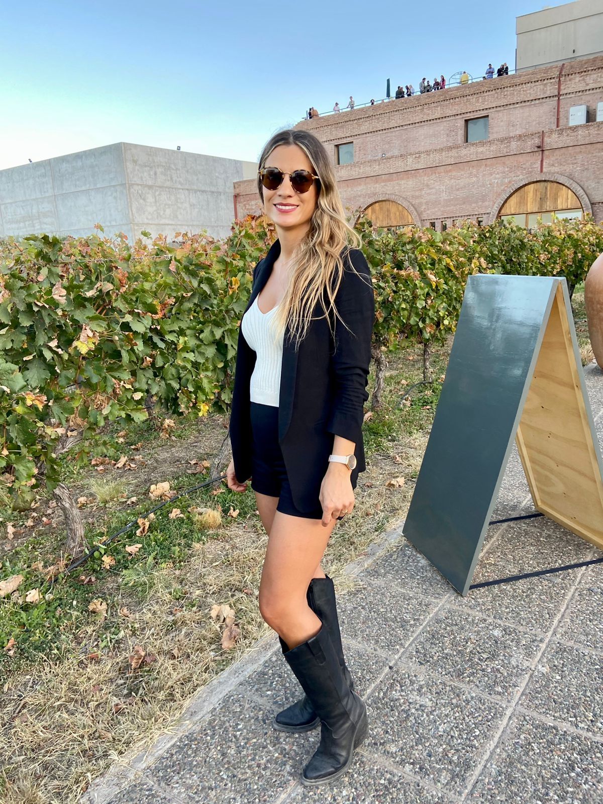Marianela Mayol confió en el espectacular día de sol y apostó por un short, combinado con blazer y botas media caña. La remera tejida blanca escote en V estiliza aún más su cuello. ¡Todos aciertos!