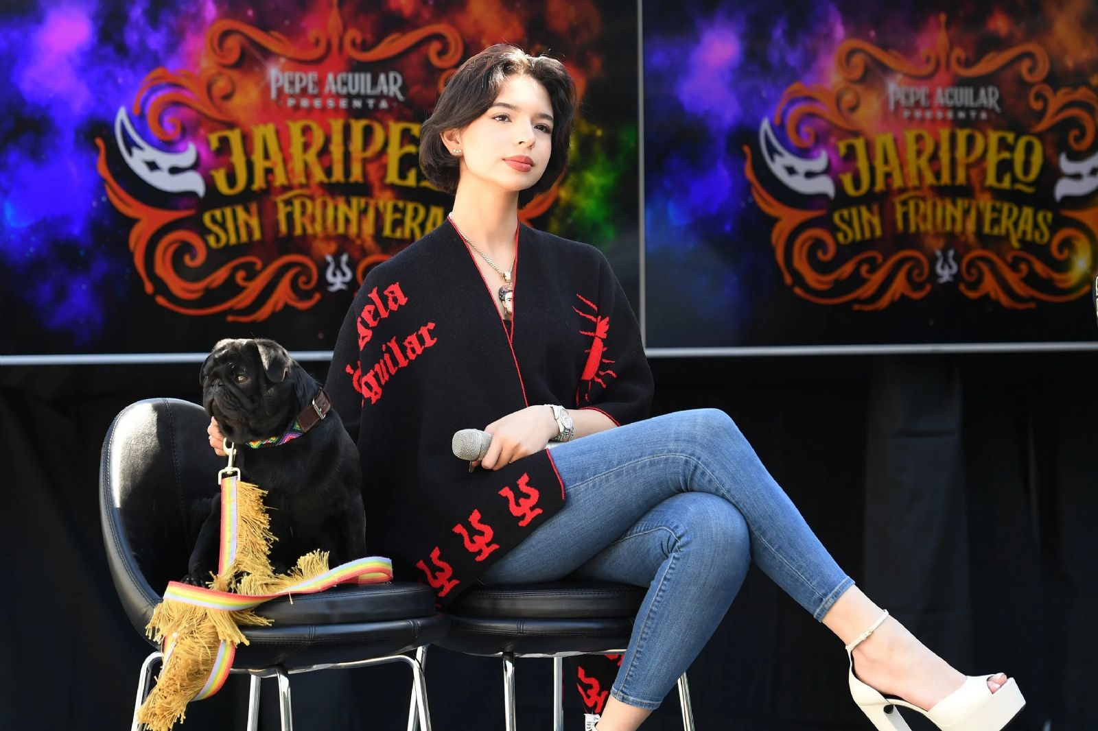 Para una rueda de prensa en Los Ángeles, California, en el marco del tour familiar "Jaripeo sin Fronteras" eligió un jean pitillo, su modelo preferido para marcar la silueta. En la parte superior lucio un poncho negro que tiene su nombre bordado en rojo y estampados geométricos.