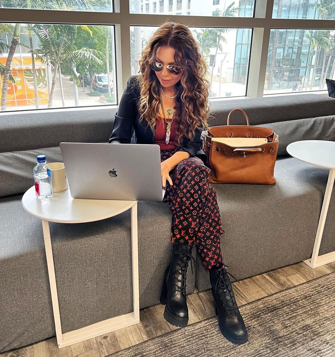 Thalía ama este pantalón, que resulta super sentador y juvenil. En épocas más frescas, Thalía usa el pantalón jogger con borcegos con taco o de suela baja, de acuerdo al plan que tenga que hacer, una camiseta color ladrillo lisa, que combina con el tono del monograma del pantalón y un blazer de cuero negro. Así el look resulta perfecto tanto para el día como para la noche, para una reunión de trabajo o una salida con amigas.