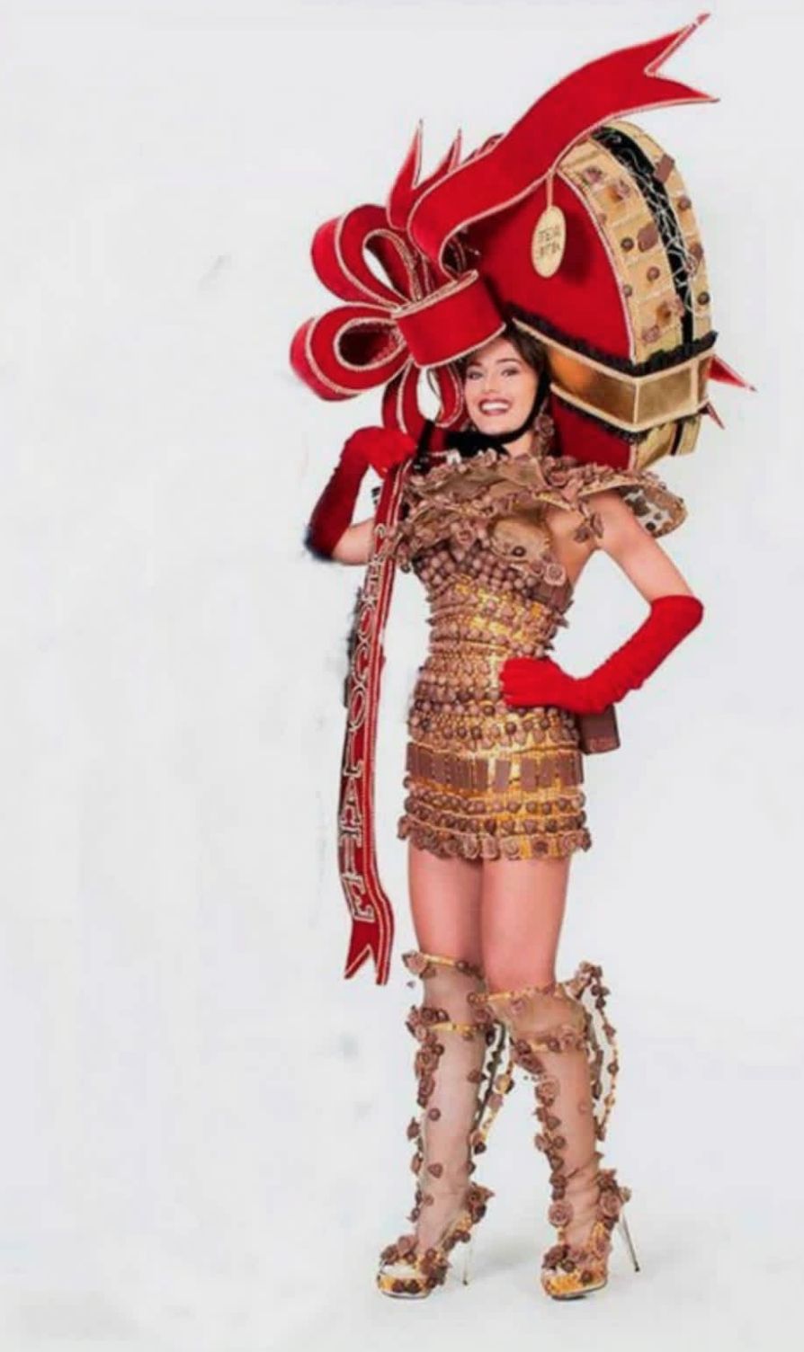 La participante de Miss Universo por Venezuela, Irene Esser generó polémica con este vestido, diseño de Osmel Sousa, inspirado en el chocolate. Eso sí, podríamos decir que exageró con el detalle del tocado en la cabeza ¡qué accesorio más pesado para desfilar!