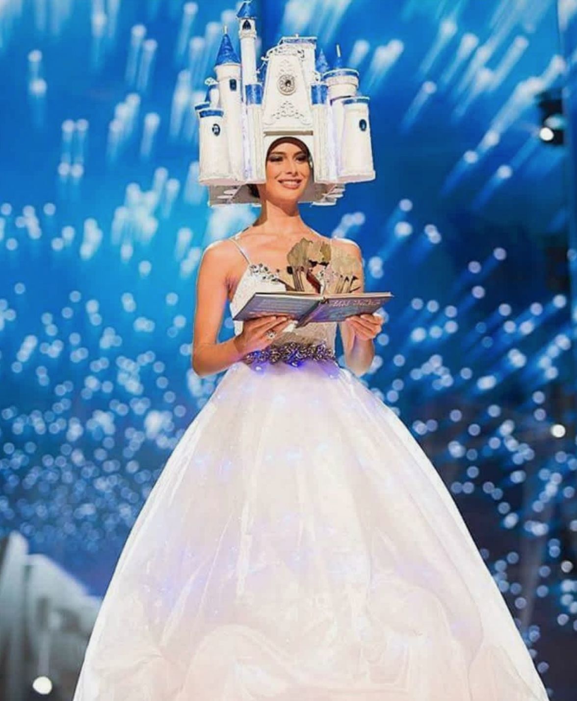Con un problema similar, vimos a la concursante de Alemania que pasó por los escenarios con un original - ¡extravagante!- vestido con un sombrero ¡de castillo! Todos los cuentos de los hermanos Grimm representados en este complemento que tal vez haya sido un poquito exagerado ¿Ustedes qué creen?