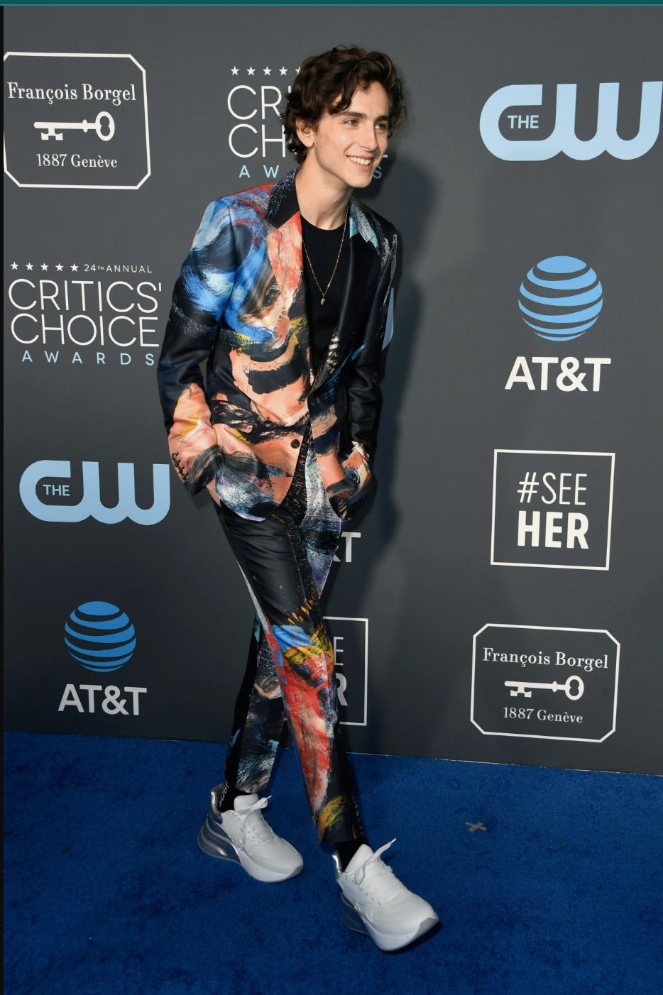 El actor pasó por los Critics Choice Awards ostentando su amor por la moda al mismo tiempo que por la actuación cinematográfica. Al menos, así lo demostró con un traje lujoso pero lleno de estilo con estampa color pastel sobre un satinado negro firmado por Alexander McQueen. El diseñador le aconsejó combinarlo con una camiseta básica en negro y una delicada cadena de oro.