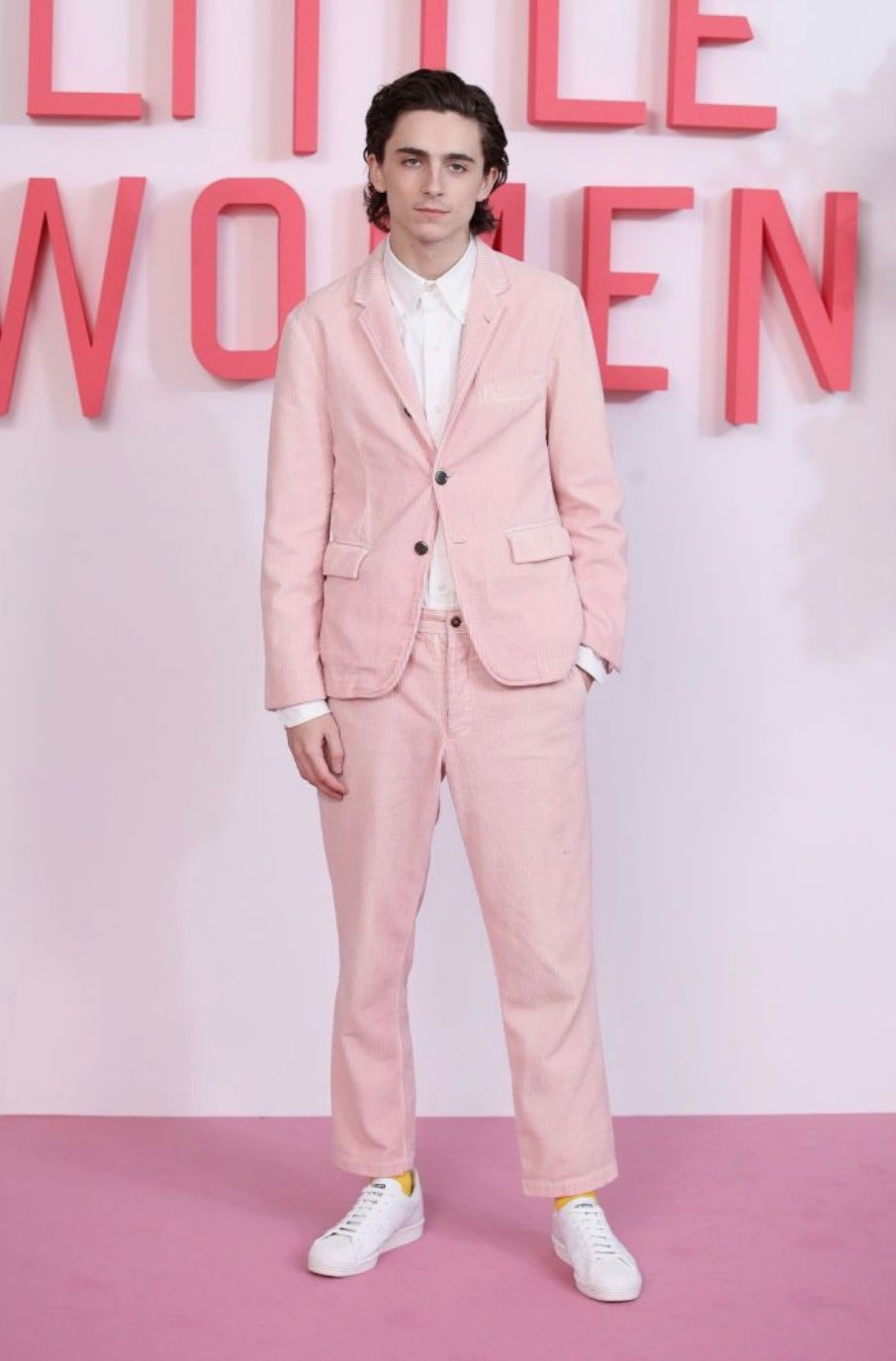 Timothée Chalamet acudió al estreno de "Mujercitas", en aquel momento, con un traje de pana rosado de Tom Browne. Aún no era tan conocido pero ya llamaba la atención desde su propuesta y su carisma en la alfombra roja y en la pantalla.