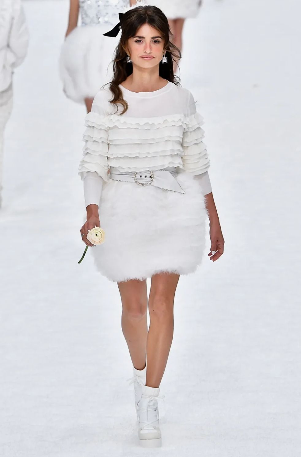 Su look invernal con botas acolchadas con lazos, falda de piel sintética, cinto de ecocuero blanco con brillantes y blusa con volados dejaron boquiabiertos a los fans de esta icónica casa de moda representando el espíritu de Karl Lagerfeld mejor que nunca.