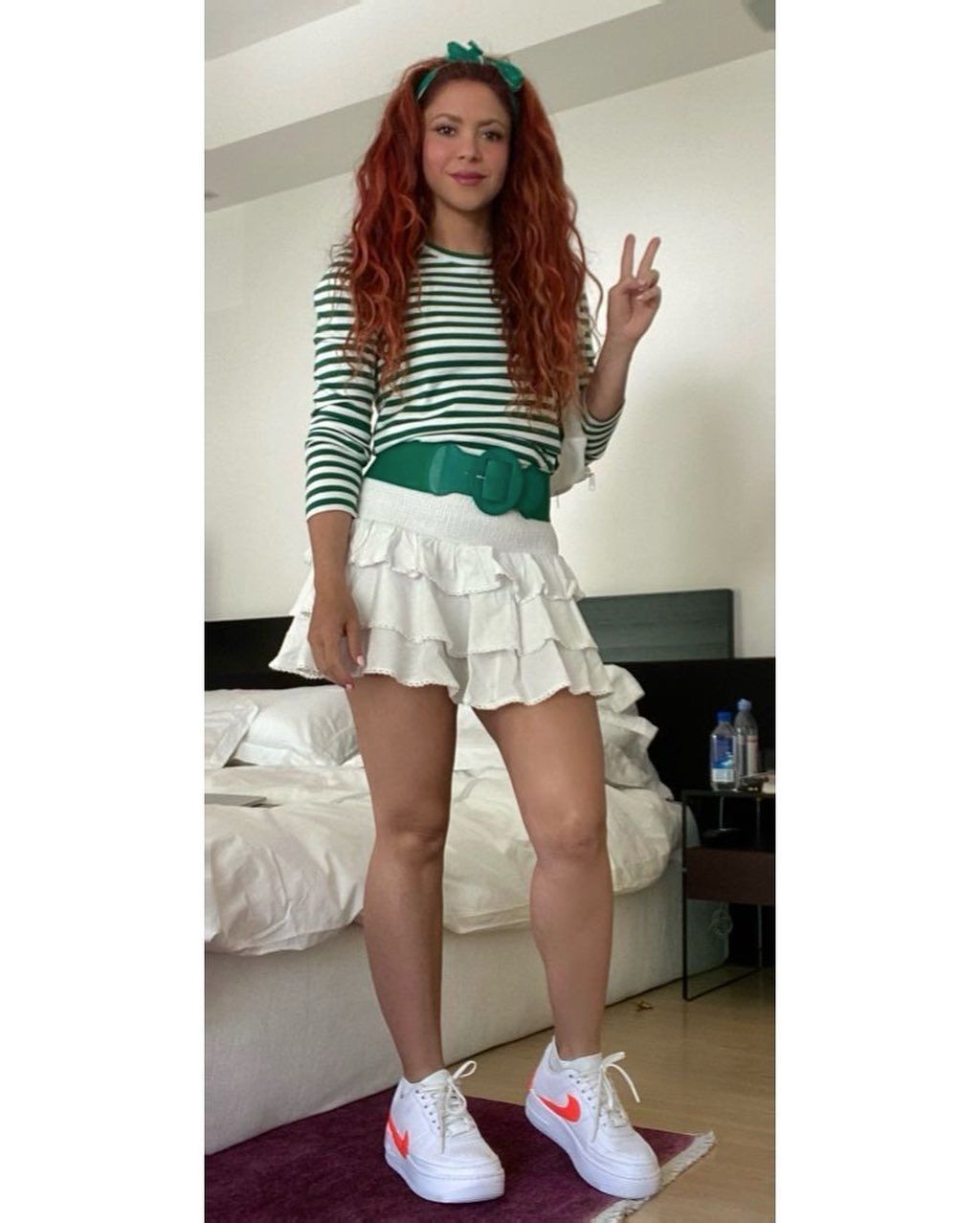 En otra oportunidad, lució una minifalda blanca con volados con ese toque vintage que nos enloquece y un suéter a rayas blancas y verdes, cinturón verde y tenis blancos ¡súper chic!