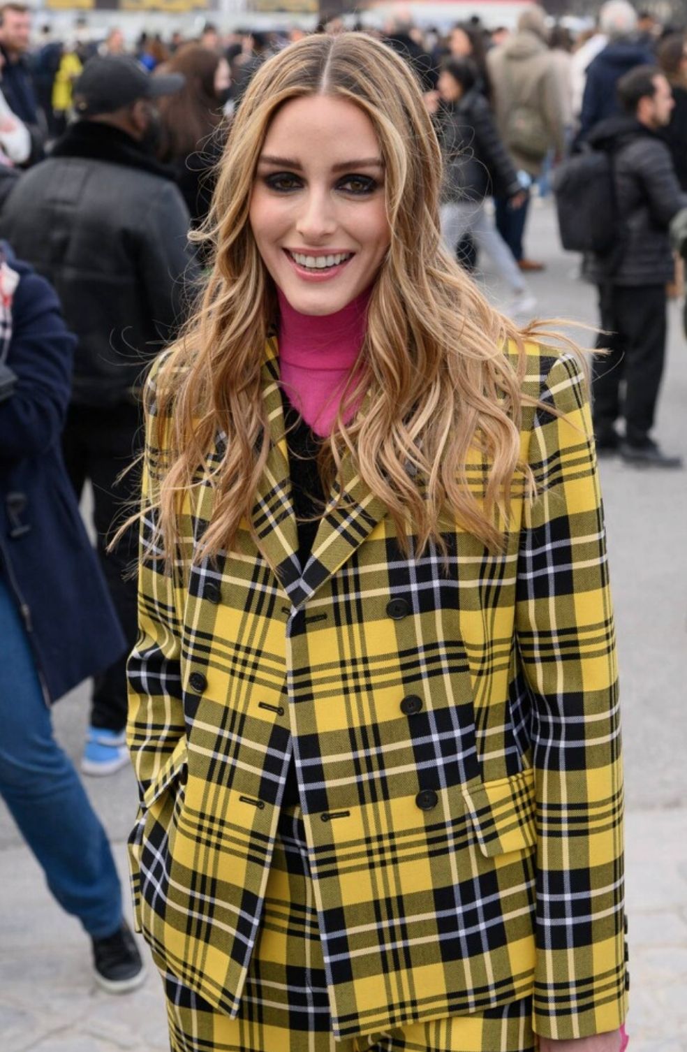 Olivia Palermo lució un traje Clueless con estampa cuadriculada en amarillo y negro para el desfile de Dior, hace unas semanas en París. Allí, mostró como combinarlo con una polera fucsia y un chaleco negro por encima de la prenda.