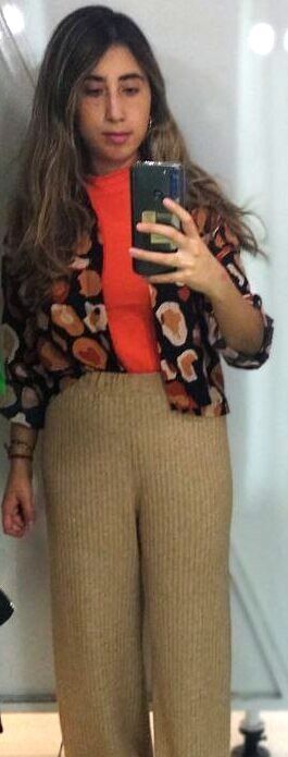 En este primer outfit, el marrón y sus tonalidades son los protagonistas. Nosotras elegimos un pantalón beige de lanilla junto con un top naranja de cuello alto y con mangas 3/4, y una camisa estampada de estilo psicodélica.