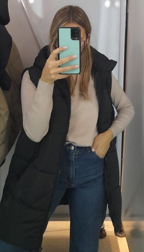 Otra de las prendas tendencia 2022 es el chaleco. En este caso, lo vemos de estilo impermeable en negro junto con unos jeans wide leg clásicos y un sweater beige. Si no te gustan este tipo de chalecos, puedes cambiarlo por uno de eco cuero o sastre que también son ideales para esta temporada.