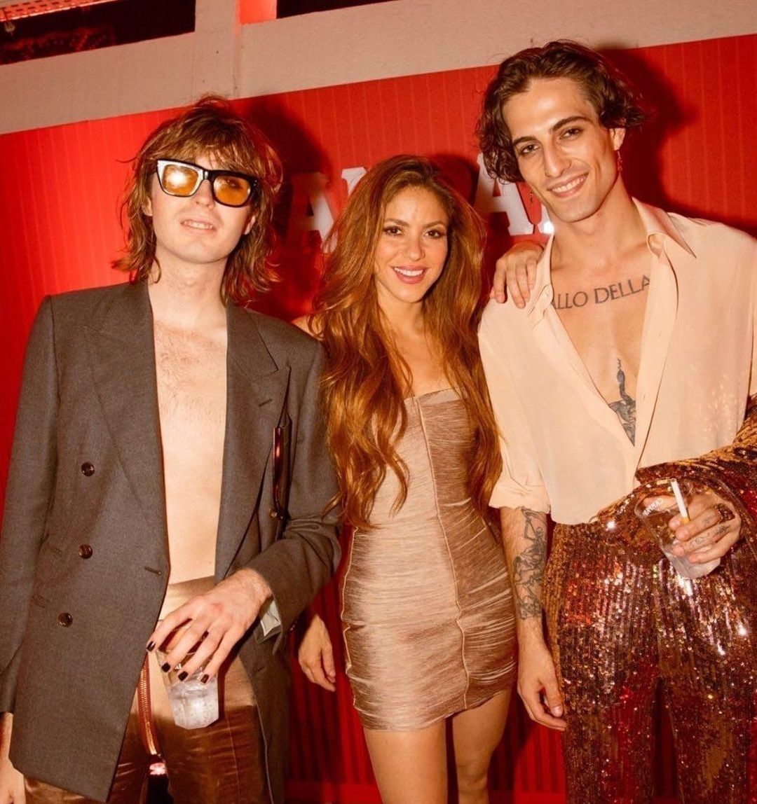 El diseño de matiz cobre fue compartido por ella misma en sus redes sociales en una postal que la muestra sonriente y espectacularmente producida junto a los integrantes de la banda musical italiana Måneskin.