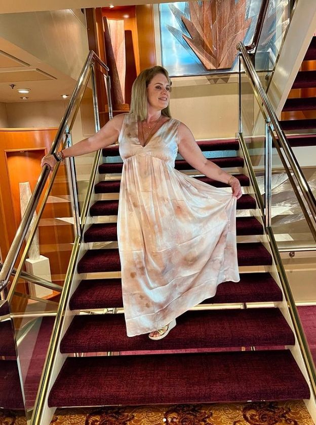 Otra manera de lucir un vestido elegante que inspire a mujeres maduras, es esta. La actriz eligió un elegante look color arena y ahí sí que demostró ser toda una reina. De esa manera, dio cátedra de moda. Una vez más, causó furor entre sus 4.8 millones de seguidores con un par de fotografías en las que se la vio desde unas escaleras.