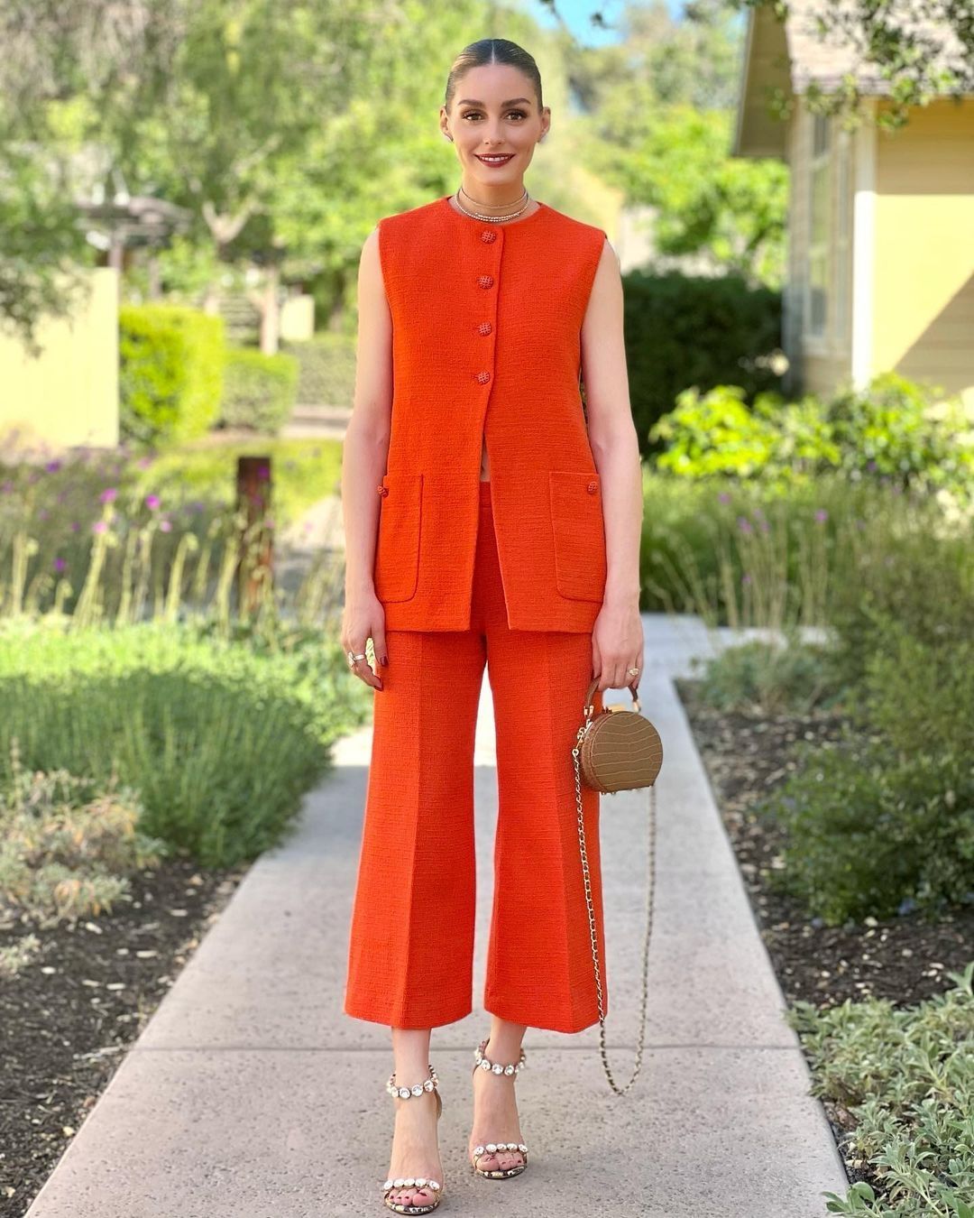 Eso sí, eligió un conjunto de dos piezas en naranja liso para combinar delicadamente con un mini bolso redondo en tono tostado y unas increíbles sandalias de piedras en tono cristal.