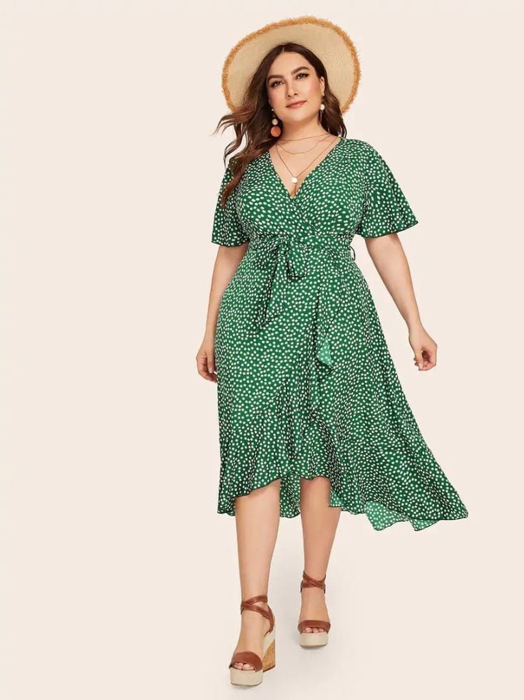 Los estampados de tamaño mediano los podés usar en un total look, por ejemplo un wrap dress (los vestidos que se atan alrededor del cuerpo) que al tener escote en v y falda en A son sumamente favorecedores.