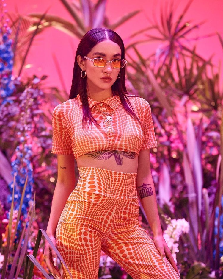Para el videoclip de No eres tu soy yo con Danny Ocean, junto a su estilista optaron por un look estampado con círculos en naranja y blanco. Llevó una camisa crop y una calza oxford que transmiten muchas vibras vintage. Además, llevo increíbles lentes cuadrados naranja y accesorios dorados. ¡Amamos como luce!