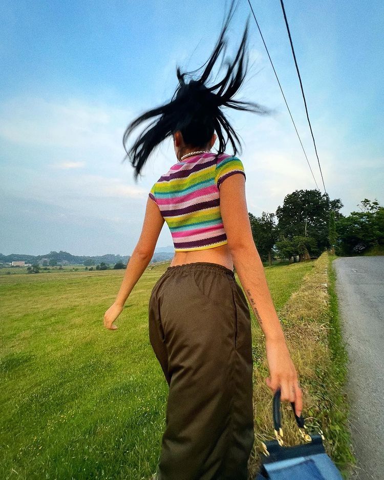 Para un viaje a Asturias, la cantante optó por un crop top de crochet de diferentes colores, tendencia absoluta esta temporada primavera-verano. Lo matcheo con un pantalón verde militar holgado, un collar de perlas y un bolso de mano denim. ¡Este look juvenil es perfecto porque respeta todas las modas del momento!