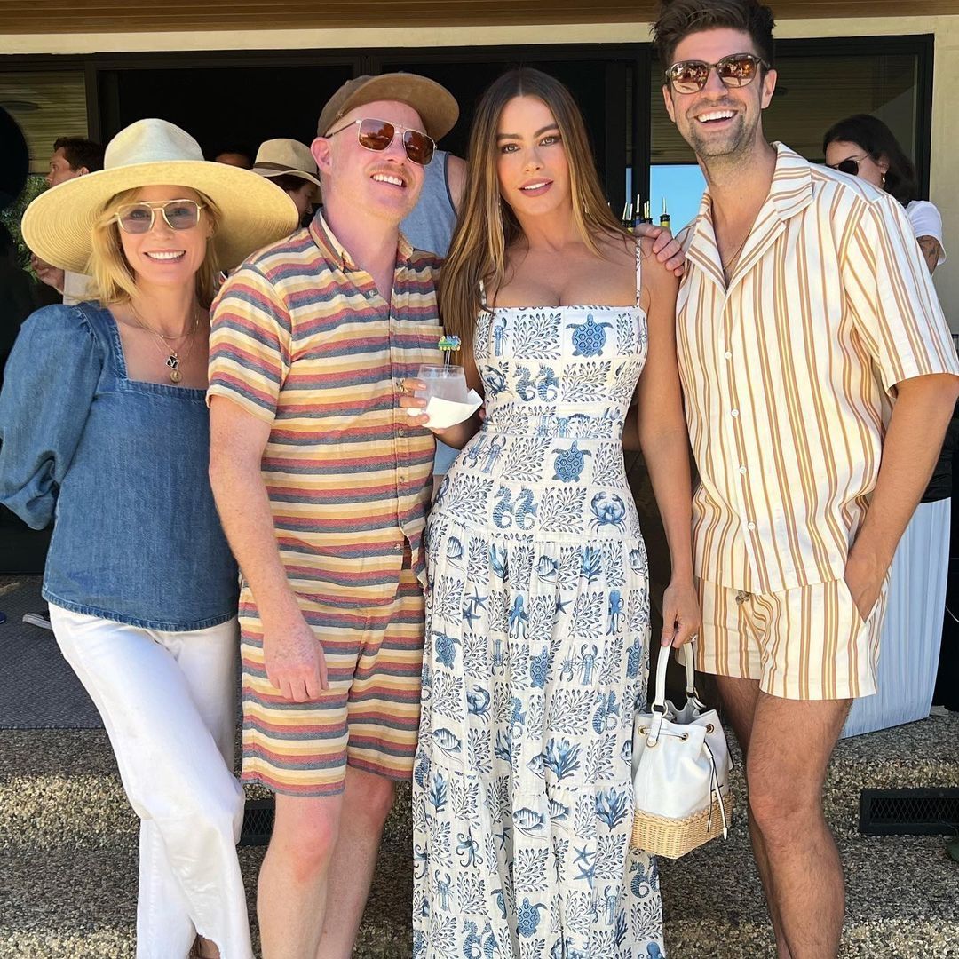 Sofía Vergara suele jugar a balancear los grandes escotes y hombros casi siempre descubiertos con el largo del vestido: este modelo en tonos playeros con tortugas marinas, estrellas de mar y otras figuras marítimas estampadas sobre blanco tiene un escote cuadrado, breteles finos que no cumplen en realidad la función de sostener, sino que la parte superior es casi un corsé recto.