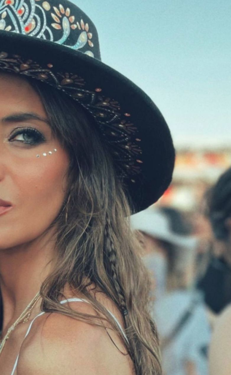 Junto con un modelo de vestido blanco de lino acampanado con abertura y tres stickers de cristales debajo de los ojos como todo maquillaje, la it gir Sara Carbonero disfrutó de la música optando por el sombrero como gran protagonista de su look.