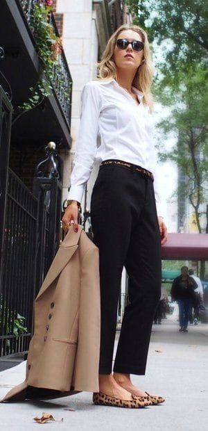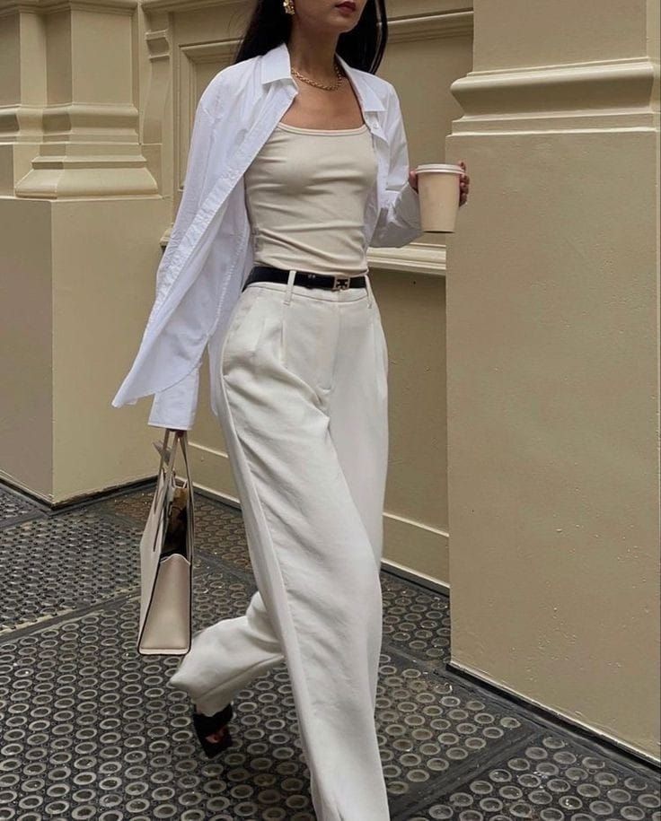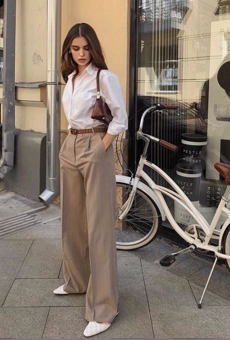 Otra combinación que está súper de moda es combinar tu camisa blanca con un pantalón sastrero de corte masculino, este look es ideal para diferentes ámbitos laborales. Si te animás, podés usar la camisa como sobrecamisa y debajo un top