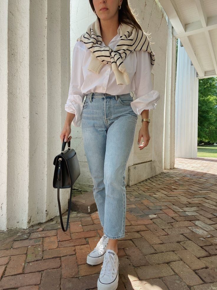 Si tu estilo es más relajado y buscás darle a tu camisa blanca un aspecto más descontracturado podés combinarla con jeans rectos y zapatillas urbanas. Este look en apariencia tan sencillo puede adquirir estilos diferentes según los accesorios que le sumes, yendo desde el boho chic hasta un look minimalista.