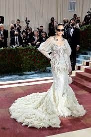 Para la Met Gala, la artista eligió 2 vestidos pero nosotras nos vamos a centrar en el que es con transparencias. Esta pieza fue diseñada por Matthew Williams y la acompañó con accesorios de Vogue y Givenchy. La prenda era de encaje crema ajustada pero con mucho volúmen. Le sumó unas botas blancas de caña alta y unas gafas negras. ¡Este look tiene mucho estilo!