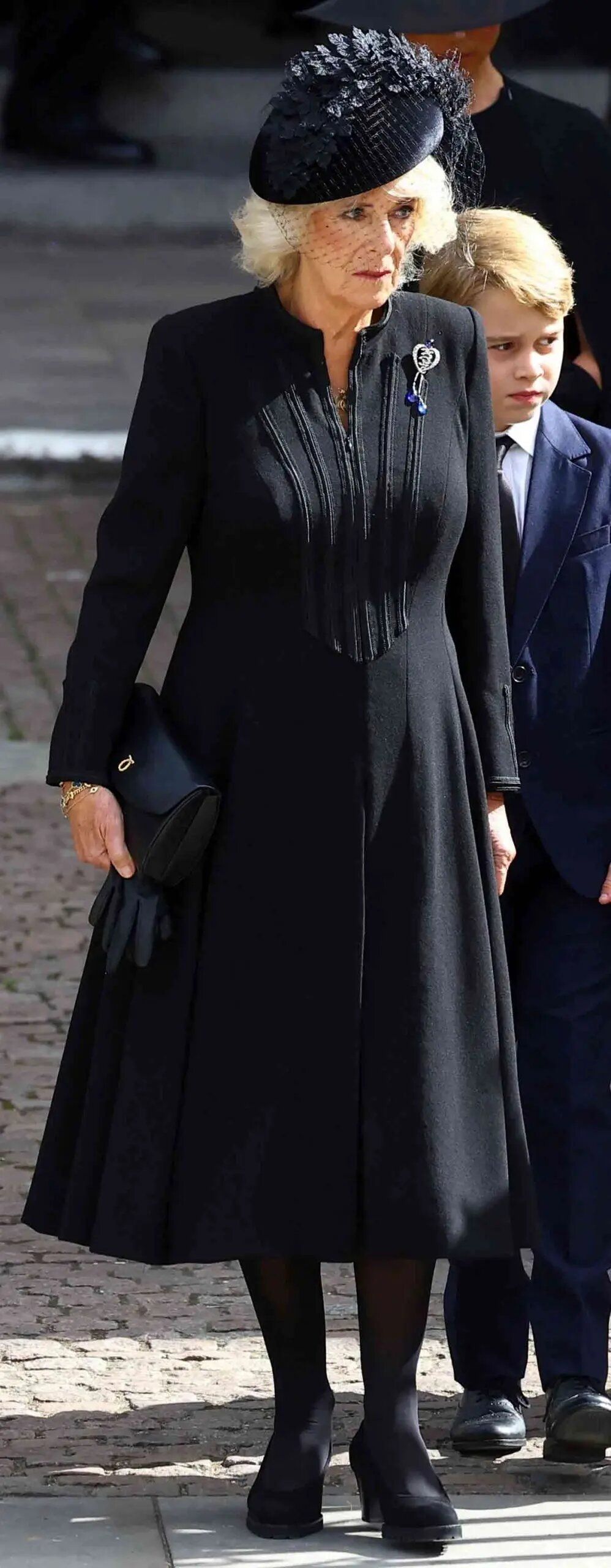 La nueva reina consorte hizo un guiño al estilo de Isabel II luciendo un broche del Jubileo de Diamantes de la Reina Victoria. El mismo tiene forma de corazón, tres zafiros engastados y el número 60 en el interior. Lució un vestido de mangas largas, escote inglés y falda plisada junto con zapatos de tacón bajo, clutch y sombrero con aplique de red y de flores en 3D.