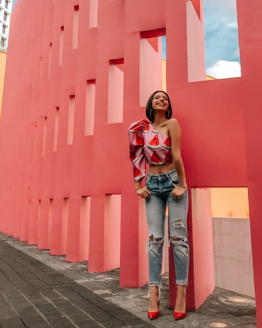 Ejemplos de estas postales tenemos miles, porque la diva mexicana adora los zapatos, como buena amante de la moda. También en Estados Unidos, ha subido a sus redes sociales un tiempo atrás una postal con tacos en punta color rojos y un top irregular de una sola manga con estampado de sandías.