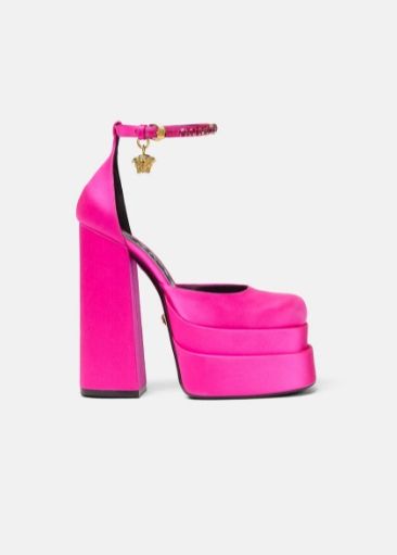 Por eso, Ángela Aguilar eligió para esta ocasión especial, unos zapatos únicos: forrados en seda satinada rosa fucsia, de tacos altos y grandes plataformas, el modelo que pertenece a la última colección de Versace se llama Medusa Aevitas y cuestan alrededor de 1500 dólares, lo que equivale a unos 33 mil pesos mexicanos.