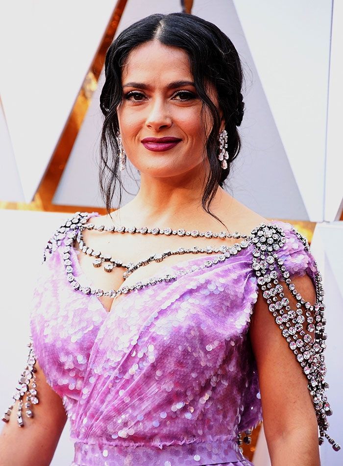 El código de vestimenta para los Oscars del 2018 era el color negro, en honor a los movimientos Time's Up y #MeToo. Pero Salma Hayek no escatimó en el brillo al vestirse para la alfombra roja de esa noche.