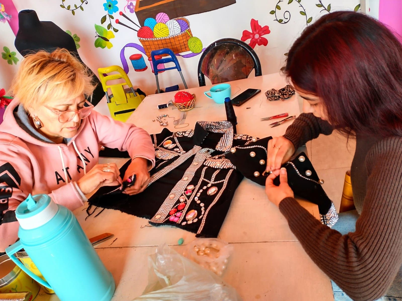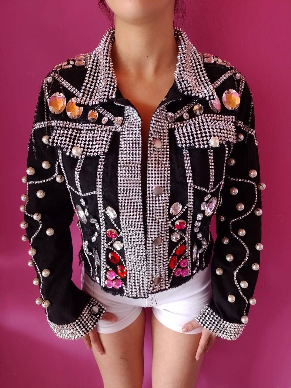 La prenda es de jean negro y lo primero que hicieron fue coser todos los bordes brillantes, el cuello y las mangas. Es todo un proceso, ya que se va cosiendo cada cuadrito a mano y lleva bastante tiempo hacerlo. Se dividieron el trabajo entre las dos. Una vez que ya estaba la primera parte lista, fueron agregando los detalles de las piedras y las perlas en la parte delantera y en las mangas. Luego, sumaron las hombreras.