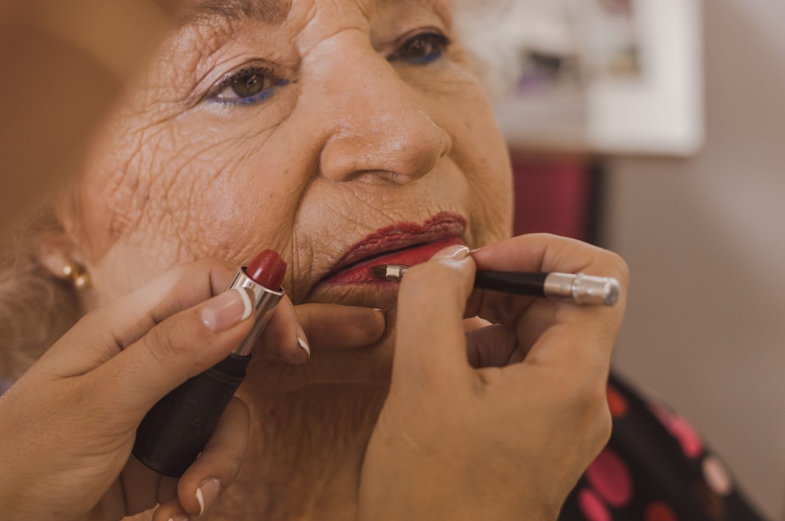 Respetamos su personalidad y gustos dejando su amado delineador azul que ha usado toda la vida en el párpado inferior y realzamos el color de sus pómulos para darle mayor calidez. Fundamental en su caso darle un contorno a los labios con un delineador del mismo tono del labial para evitar se salga por los bordes.