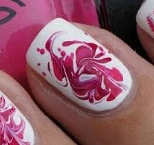 Instrucciones: podés colocar color blanco de base, unas gotas sobre él en los colores que quieras (preferiblemente varios tonos para conseguir el aspecto abstracto) y esparce con un palillo el esmalte.