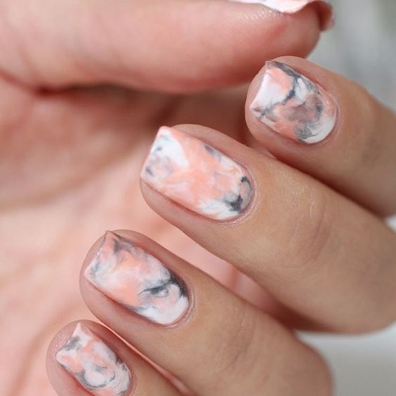 Instrucciones: escogé dos esmaltes de uñas, uno oscuro y otro más claro. Píntate las uñas con el más claro a modo de base y espera a que se seque. Después, humedecé una esponja en la laca oscura y aplícala a toquecitos, tratando de que quede un efecto irregular que imite el acabado del mármol.